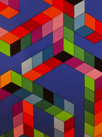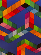 Description: Babel (1978) is a striking original screenprint by Victor Vasarely, a leading figure of the Op Art movement. This hypnotic composition plays with perspective and spatial illusion, featuring an intricate arrangement of multicolored cubes forming an impossible tower against a deep blue background.